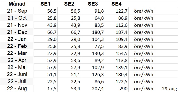 Nedan finns en tabell över prisutvecklingen på spotpriset under de senaste 12 månaderna.