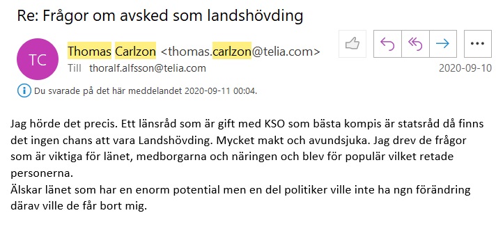 Thomas Carlzon själv var medveten om att det var länsrådet Malin Almqvist och hennes man Johan Persson (S), som är kommunstyrelsens ordförande i Kalmar, som låg bakom förtalet av honom. De hade dessutom god hjälp av statsrådet Ardalan Shekarabi, som då var civilminister och därmed kunde verkställa avsättningen av Thomas Carlzon. Vänskapskorruption och ministerstyre.