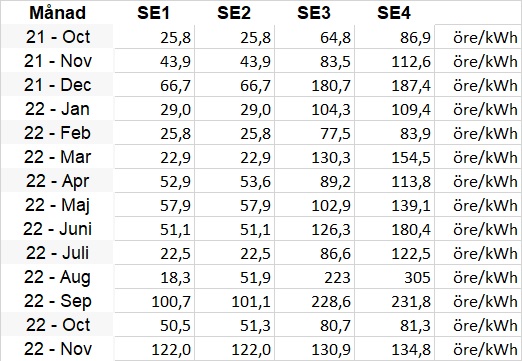 November innebar nytt spotprisrekord för norra Sverige. Elområde SE1 och SE2 fick ca 122 öre/kWh som ett månadspris. Det tidigare rekordet för norra Sverige var ca 101 öre/kWh från september. En ökning med 20 procent.