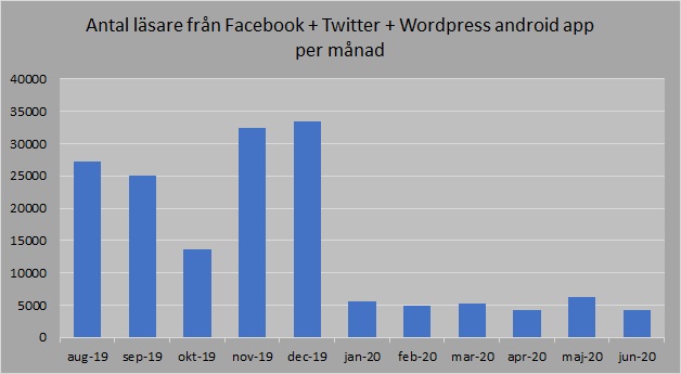 I november och december 2019 kom det varje månad drygt 30 000 unika besökare till min blogg från Facebook, Twitter och WordPress i januari 2020 var det nere på 5 000 unika besökare och låg sedan kvar där.