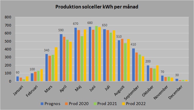 Här nedan har du ett diagram över min produktion månad för månad under 2020-2022. Prognos var det som leverantören utlovade i samband med offerten. Det lever det inte upp till riktigt men det är små skillnader som kan bero på väderstreck och vilken vinkel som taket har.