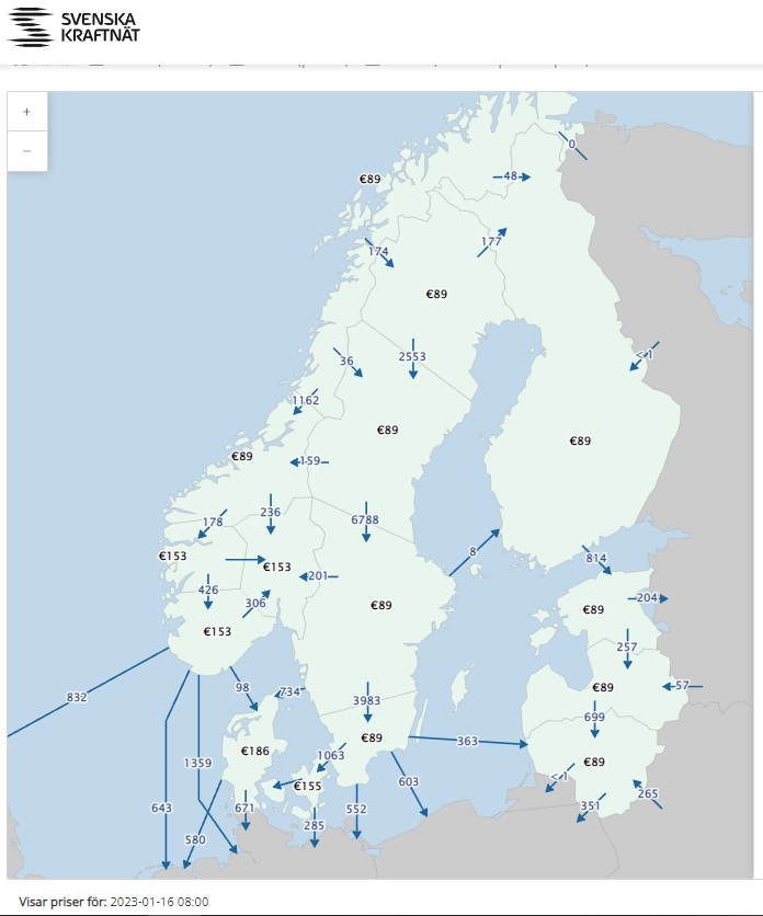 När man sedan ser kartan över flöden för elenergin så är det nästan ungefär alltid samma sak. Kablarna till Baltikum, Polen, Tyskland och Danmark är många gånger uppe på sin maxbelastning eller ganska nära.