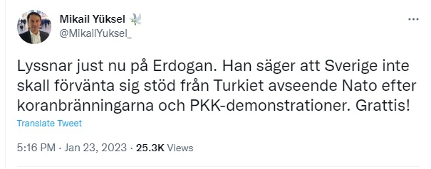 Nja, jag vet inte, eller förstår inte ovanstående citat att Sverige avsagt sig alliansfriheten, därför vet jag heller inte när vi”ansökte” om alliansfrihet, men jag antar att Mats Knutsson menar att vi avsade oss den när vår Nato-ansökan gjordes. Det måste naturligtvis ha uppmärksammats av Putin med anhang. Om vi har tur? så kanske muslimen i Ankara stoppar vår ansökan! Då blir väl alla