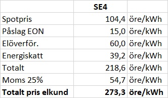 Om man sätter in spotpriset i mitt fall så kommer sannolikt det totala elpriset bli ungefär som enligt nedan.