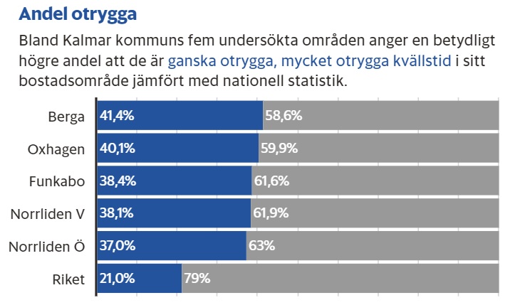 I ett helt uppslag skriver Barometern om otryggheten i vissa stadsdelar i Kalmar och att en stor andel kvinnor avstår från att gå ut efter mörkrets inbrott i dessa stadsdelar. Det visar en trygghetsmätning som kommunen låtit utföra i stadsdelarna. Men några riktiga slutsatser om orsakerna har kommunen ännu inte kommit fram till, de har inte analyserat klart resultatet av undersökningen.