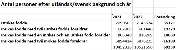 SCB:s senaste statistik är ingen rolig att läsning. Hela befolkningsökningen i riket under 2022 består av personer med utländsk bakgrund och mer därtill.