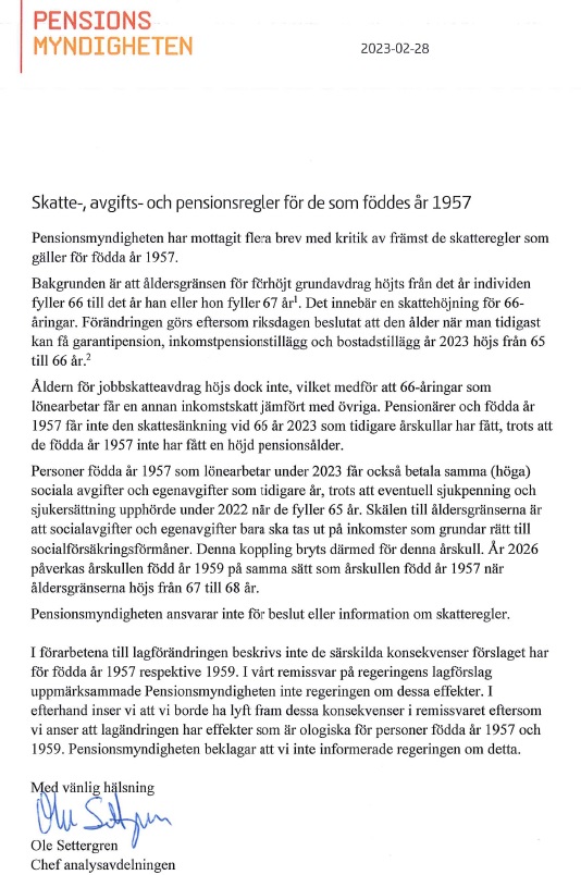 ”I förarbetena till lagförändringen beskrivs inte de särskilda konsekvenser förslaget har för födda år 1957 respektive 1959. I vårt remissvar på regeringens lagförslag uppmärksammade Pensionsmyndigheten inte regeringen om dessa effekter. I efterhand inser vi att vi borde lyft fram dessa konsekvenser i remissvaret eftersom vi anser att lagändringen har effekter som är ologiska för personer födda år 1975 och 1959- Pensionsmyndigheten beklagar att vi inte informerade regeringen om detta.”