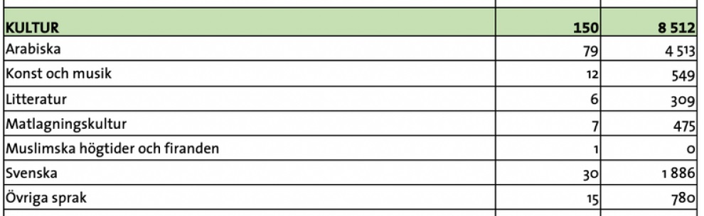 De två största ämnena i studiecirklarna om Arabiska och Folkbildning om islam, totalt drygt 7 500 timmar vid 166 tillfällen. 45 timmar med bidrag vid varje tillfälle.