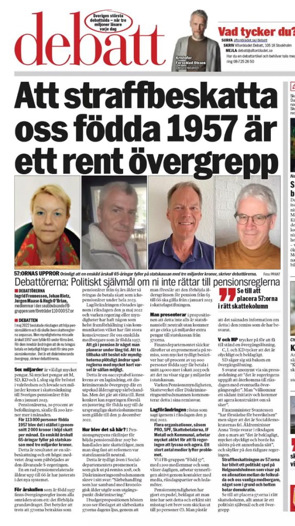”Jag vill veta hur ni som lokala företrädare i riksdagen ställer er i frågan om att införa en övergångsregel för de som är födda 1957 under 2023.”
