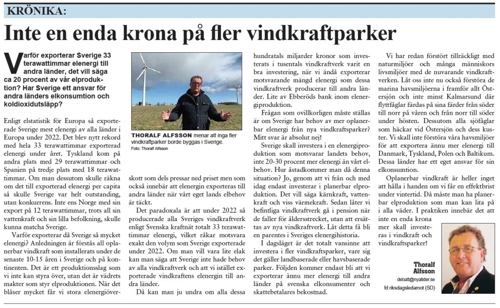 Min debattartikel om att vi borde sluta investera i vindkraft och vindkraftsparker har publicerats på flera olika ställen. Bland annat Barometern och Dagens Kalmar men Dagens Nyheter nekade dock en publicering, den följer inte Dagens Nyheters agenda och narrativ. Jag hade dock förväntat mig att någon skulle bemöta min debattartikel men det har uteblivit helt och hållet. Jag hoppas dock att den kommer publiceras i fler tidningar.