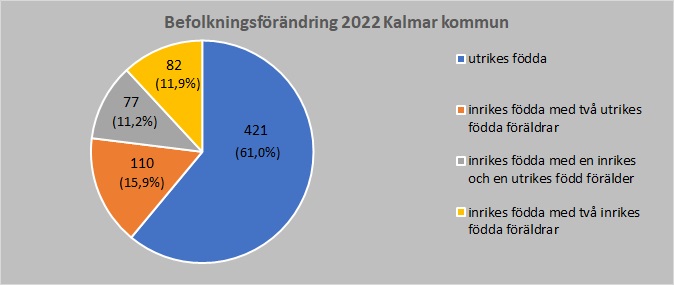 Befolkningsförändring 2022. Befolkningsökningen bestod till 77 procent av personer med utländsk bakgrund, endast 11,9 procent av ökningen hade två inrikes födda föräldrar.