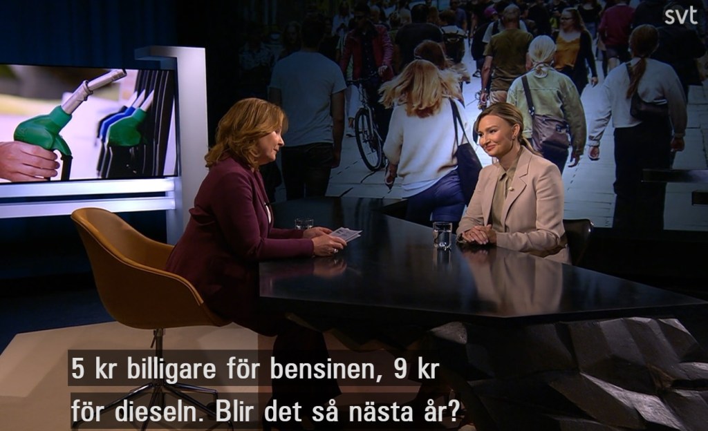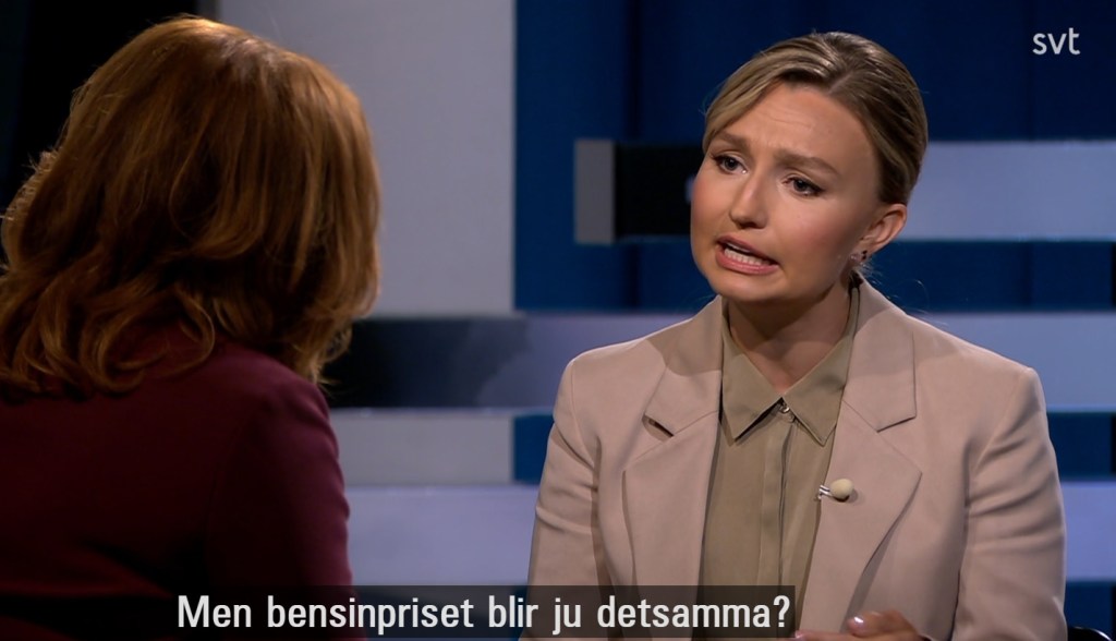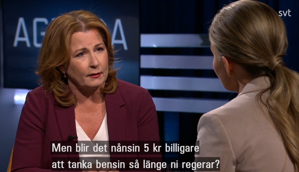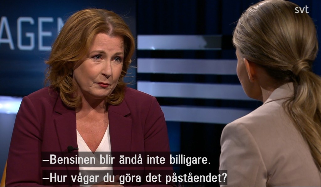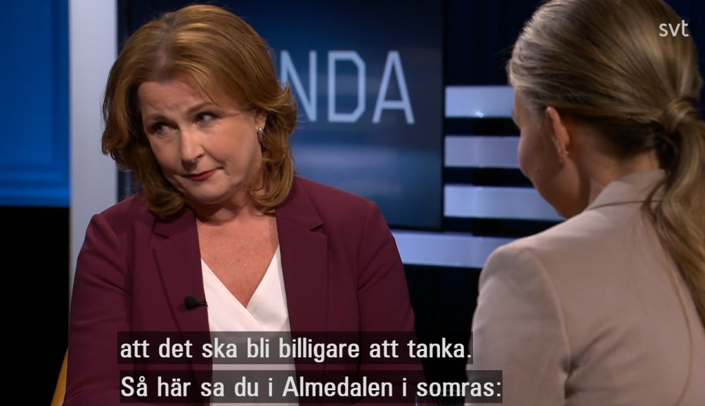 Vi kan börja med inledningen på intervjun där Anna Hedenmo hänvisat till ett tal av Ebba Busch om drivmedelspriserna.
