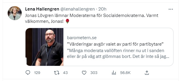 Nöden har uppenbarligen ingen lag för Jonas Lövgren. Frågan är om Socialdemokraterna kommer ge honom något förtroendeuppdrag som ger Jonas Lövgren lite inkomst? Eller om de bara utnyttjar hans avhopp på sociala medier som Johan Persson och Lena Hallengren t.ex. gör.