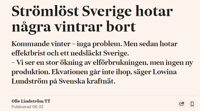 Nu har jag läst rapporten från Svenska kraftnät och inget stämmer. Sverige kommer inte bli strömlöst, vi har ingen ökning av elförbrukningen och det tillkommer ny elproduktion!