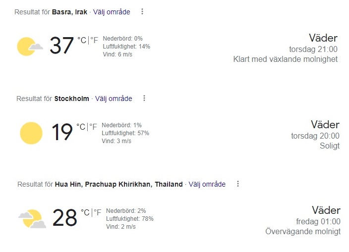 Jag kollade dagens luftfuktighet i Basra, Stockholm och Huahin i Thailand. Jag fick följande siffror.