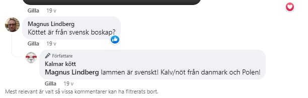 Kalmar Kött AB har en Facebooksida. Jag såg att svenskar flera gånger frågat på Facebook om varifrån köttet kommer och fått följande svar.