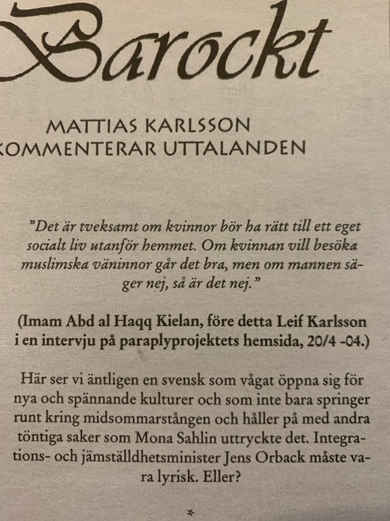 Mattias Karlsson hade en stående spalt i SD-Kuriren som kallades för Barockt!