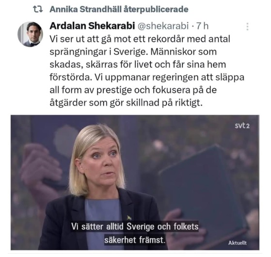 ## Ardalan Shekarabi, tidigare minister i S-regeringen och en floskelmaskin som nästan kan mäta sig med Morgan Johansson, oroar sig nu över de många sprängningarna som skakar Sverige.