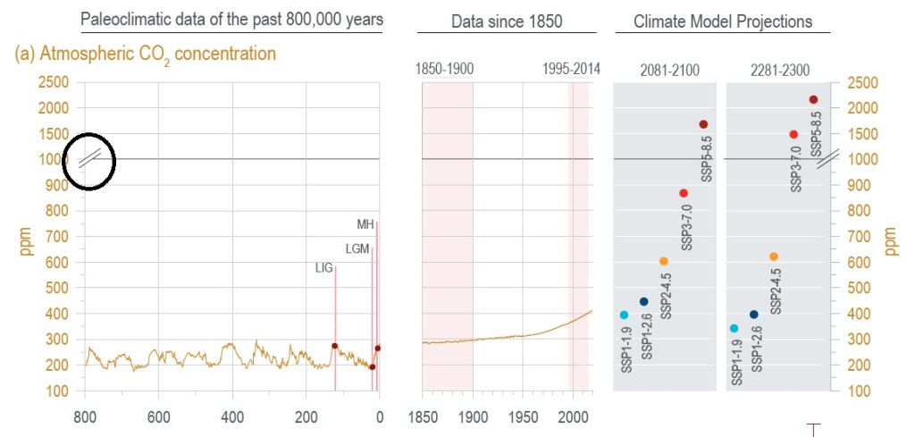 Vad innebär då SSP5-8.5 när det gäller CO2-halt i atmosfären? Följande diagram finns i IPCC-rapport AR6.