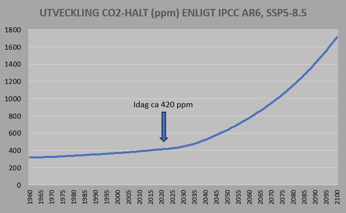 Läser man av värdet för SSP5-8.5 vid år 2100 så skall CO2-halten i atmosfären vara ca 1 700 ppm.