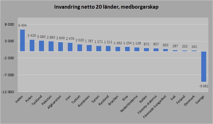 Om man sedan tittar på nettoinvandringen från de 20 länder med högst invandring under 2022 så får man Indien i topp 6 404 personer och med Polen som tvåa och Tyskland som trea.