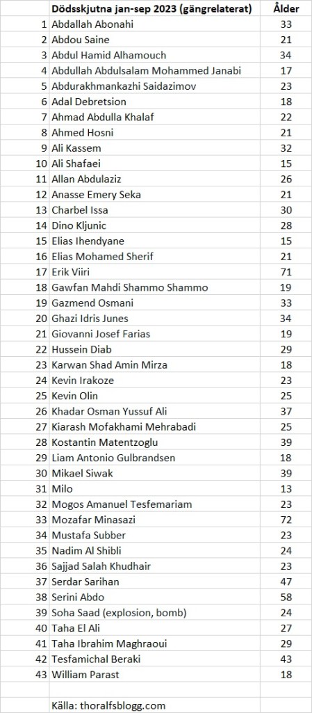 Listan som då gäller januari till och med september 2023 innehåller 43 dödsoffer för gängbrottsligheten. Det går inte att hitta en enda Andersson, Johansson, Karlsson eller Svensson i listan, precis samma som gällt för tidigare år.