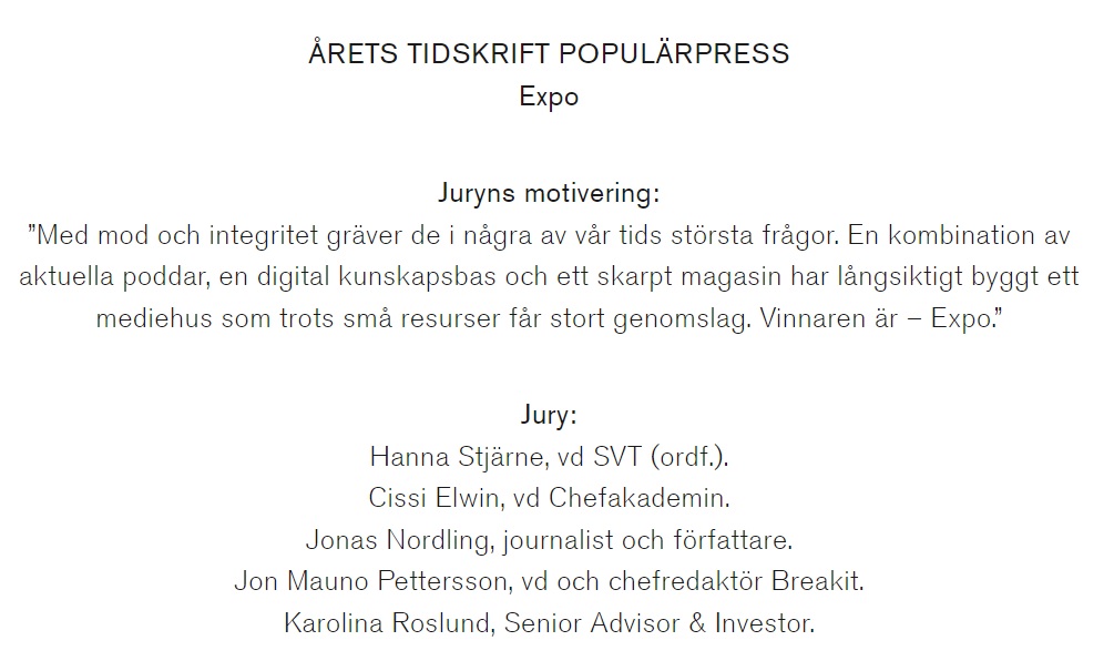 I veckan delade Sverige Tidskrifter ut priset till årets tidskrift. Vem tror ni fick det? EXPO!