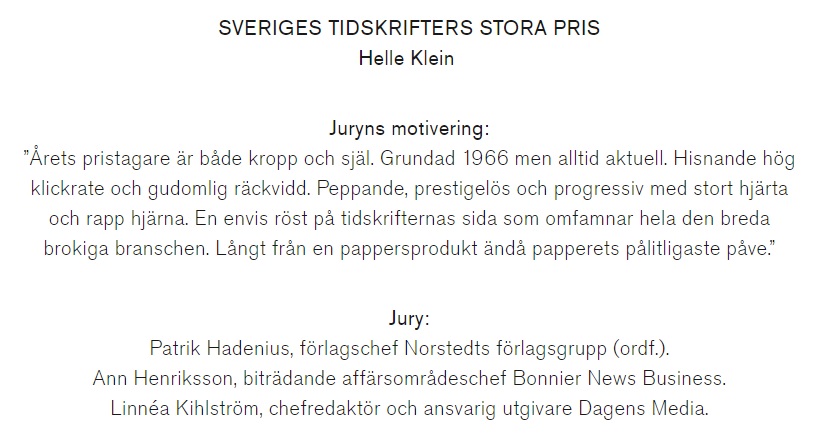 Som inte det vore nog gick Sveriges Tidskrifters stora pris till Helle Klein! Suck!