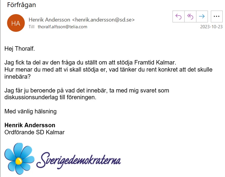 Några veckor efter att jag startat namninsamlingen mot moskébygget i Kalmar den 20 september, så hörde jag av mig till SD Kalmar och frågade om de ville stödja namninsamlingen. SD Kalmar hade ju inte lyckats få ihop tillräckligt med namnunderskrifter själva. Svaret var att SD Kalmar inte hade fått någon förfrågan att stödja Framtid Kalmars namninsamling.