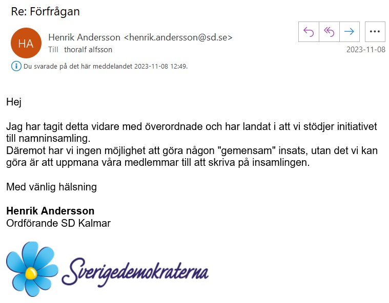 Nu har jag dessutom också förstått att SD Kalmar inte ens uppmanat sina medlemmar att skriva på namninsamlingen, vare sig i ett medlemsbrev eller i ett mejlutskick.