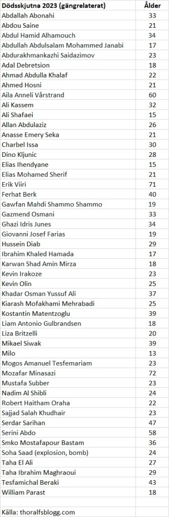 Då har jag sammanställt listan på dödsskjutna under 2023. Jag saknar fortfarande namnet på den person som sköts till döds i Växjö den 8 oktober. Om jag tar med den unga kvinna som dog vid sprängningen av ett hus utanför Uppsala så är det 50 personer som bragts om livet av gängkriminella under 2023.