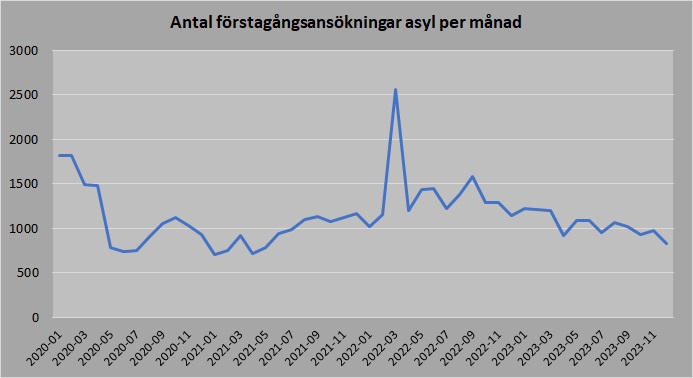 Det man från toppen i september 2022 kan se är en vikande trend. Nu är det mindre än tusen personer som söker asyl varje månad. Fortsätter den trenden kommer vi snart vara under 500 per månad.
