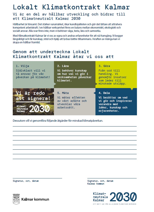Nu har nio företag i Kalmar skrivit ett klimatkontrakt med Kalmar kommun enligt en artikel i Barometern. Undrar om det är kommunalrådet och socialdemokraten Johan Persson som skriver på detta lokala klimatkontrakt från Kalmar kommun sida? Undrar i så fall vilka garantier Johan Persson utlovar.
