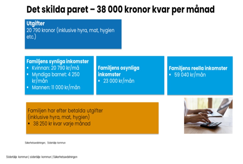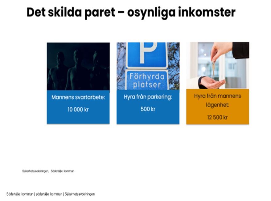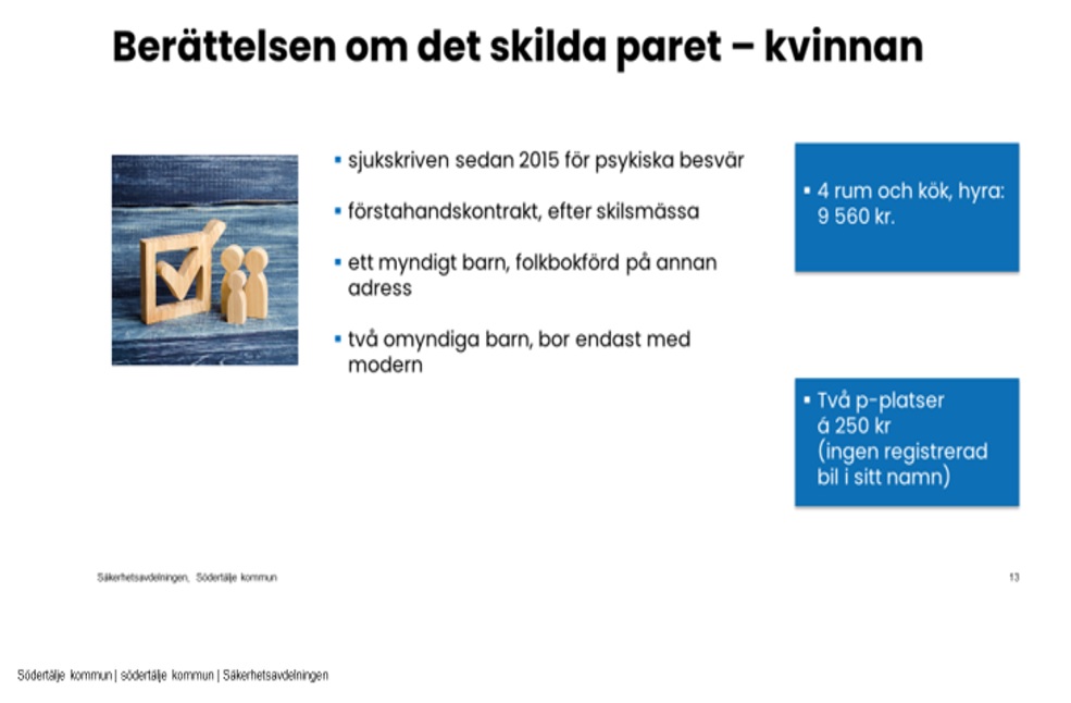 Under föreläsningen visade Anna Flink ett exempel på hur bidragsfuskandet kunde gå till. Jag gissar att det var ett exempel från verkligheten i Södertälje.