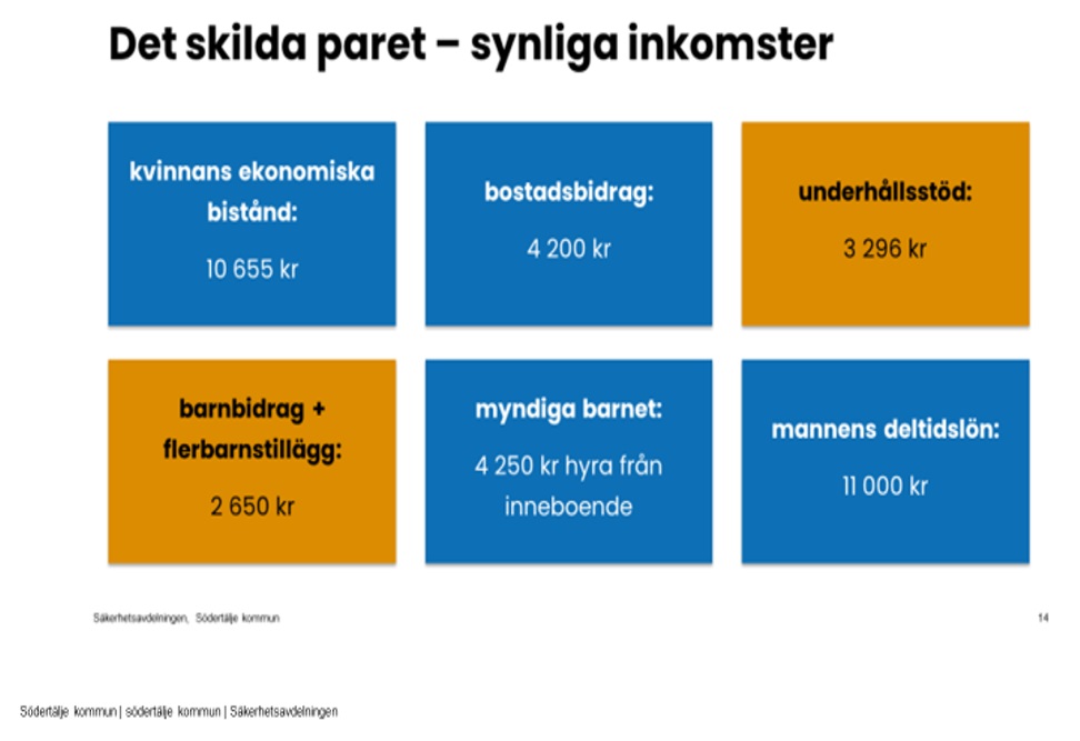 Jag tänkte visa några bilder från hennes presentation från detta exempel på hur det kan gå till. Det handlar om familjen med flera barn där man har genomfört en skenskilsmässa för att öka bidragen.