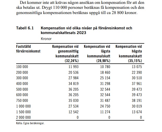 I propositionen finns en tabell över hur stor kompensation kommer bli vid olika inkomstnivåer och vid tre olika nivåer på kommunalskatten. Se tabellen nedan.