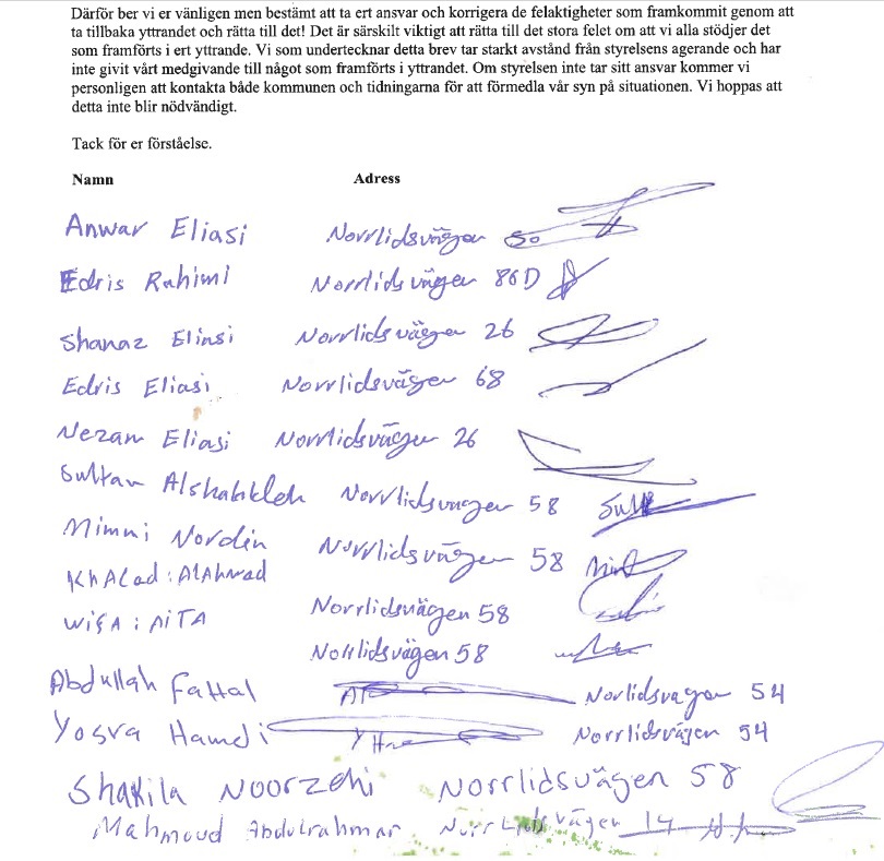 Dessa tre personer som skrivit under är med andra ord inte boende och medlemmar i dessa bostadsrättsföreningar.