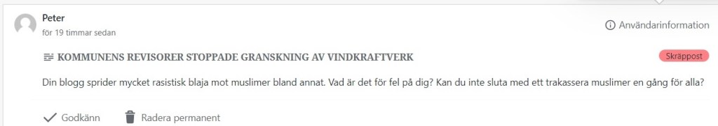 Han har till och med kommenterat på min blogg under sitt eget namn för ca 4 år sedan och då angett sin mejladress på det företag han är anställd av i Kalmar. Något som arbetsgivaren säkert inte kommer gilla om jag publicerar dessa kommentarer.