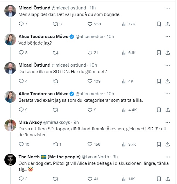 Intressant att Alice Teodorescu Måwe tror att hon oemotsagd kan förolämpa drygt 20% av Svenska väljarkåren och kalla dem rasister m.fl. andra invektiv. Lite storhetsvansinne?