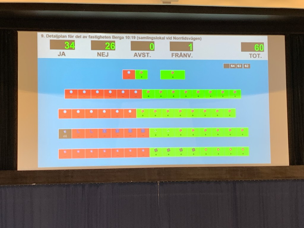 Sverigedemokraterna yrkade på en återremiss av detaljplanen men fick inte stöd av något parti. När det yrkandet hade fallit så ställdes majoritetens (S, V och C) yrkande om bifall till detaljplanen mot oppositionens (SD, M, KD och L) yrkande på avslag. Även de två Miljöpartisterna yrkade på bifall till detaljplanen, trots att ännu ett grönområde nu kommer bebyggas.
