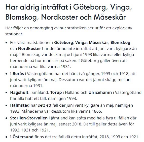 Så skriver dessa anställda på SMHI. För vissa väderstationer som har varit igång ända sedan 1800-talet har det aldrig inträffat att medeltemperaturen varit lägre i juni än vad den var i maj. Det måste väl ändå ses som en extrem väderhändelse. Men det finns ett stort fel.