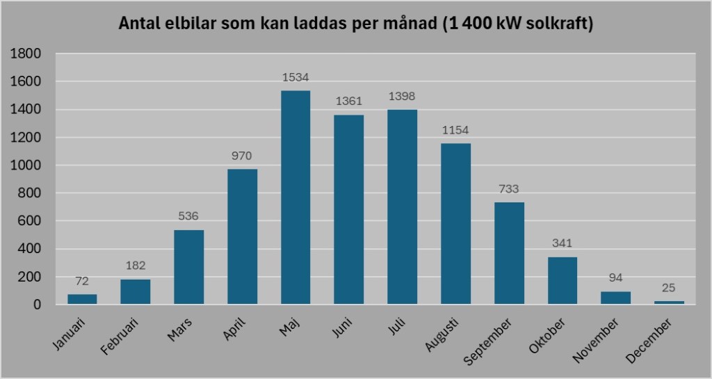 I december skulle bara 25 av de 700 elbilarna kunna laddas från den här solcellsparken men under de riktiga sommarmånaderna maj, juni och juli skulle man kunna ladda ca 1 400 elbilar varje månad med solcellsparken.