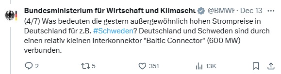 Det tyska näringsdepartementet skriver på X att Sverige profiterar på tysk vindkraft och får billig tysk förnybar elenergi.
