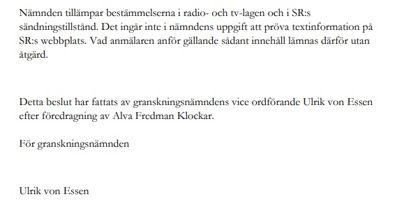 Den 18 december kom beslutet från Granskningsnämnden som i vanlig ordning friade inslaget.