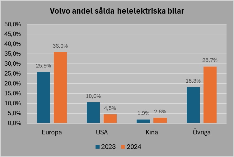 USA har bara en bråkdel av försäljningen av Volvo Cars elbilar, kanske en effekt av valrörelsen i USA då försäljningen under 2024 mer än halverades i jämförelse med 2023. Har USA nyktrat till? Mina läsare kommer kanske ihåg hur hyrbilsföretagen i USA under 2024 började sälja sina Tesla då kunderna inte ville hyra dem.