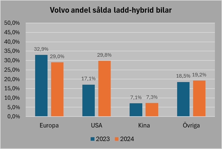 När det gäller laddhybrider så har andelen laddhybrider ökat i USA under 2024 men i Kina har Volvo Car uppenbarligen svårt med även laddhybrider. I Europa så är det en liten minskning under 2024.