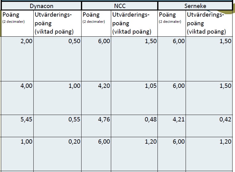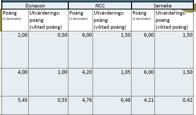 Eftersom viktningen är endast 10 procent så handlar det bara om hundradelar i skillnad mellan de olika anbuden. Nu har Dynacon totalt 2,05 poäng, NCC 3,03 poäng och Serneke 3,42 poäng.