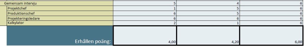 Ett antal nyckelpersoner har fått svara på ett antal frågor. Vilka frågor framgår inte. Det lite märkliga är nu att helt plötsligt så får Dynacon den högsta poängen med 5,45 poäng, följt av NCC med 4,76 och Serneke med 4,21 poäng. Efter viktningen med 10 procent fås nedanstående poäng för kriteriet.