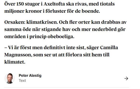 Det är Dagens Nyheters egen klimatalarmist Peter Alestig som skrivit artikeln. Axeltofta är ett kolonistugeområde Landskrona, intill Öresund och med utloppet från Saxån till Öresund alldeles intill koloniområdet. Så här skriver Peter Alestig.