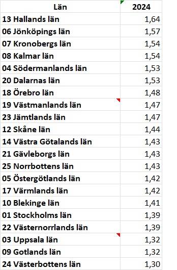 Det har däremot jag gjort. Då kan jag konstatera att Kalmar län är ett av de län med högst barnafödande. Även om siffran är låg i ett historiskt perspektiv så delar faktiskt länet tredjeplatsen med Kronoberg med 1,54 barn per kvinna. Betydligt högre än riksgenomsnittet.